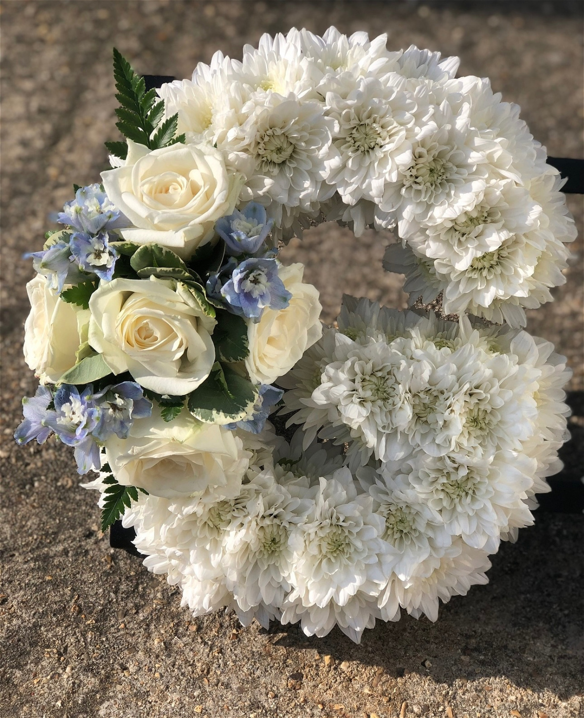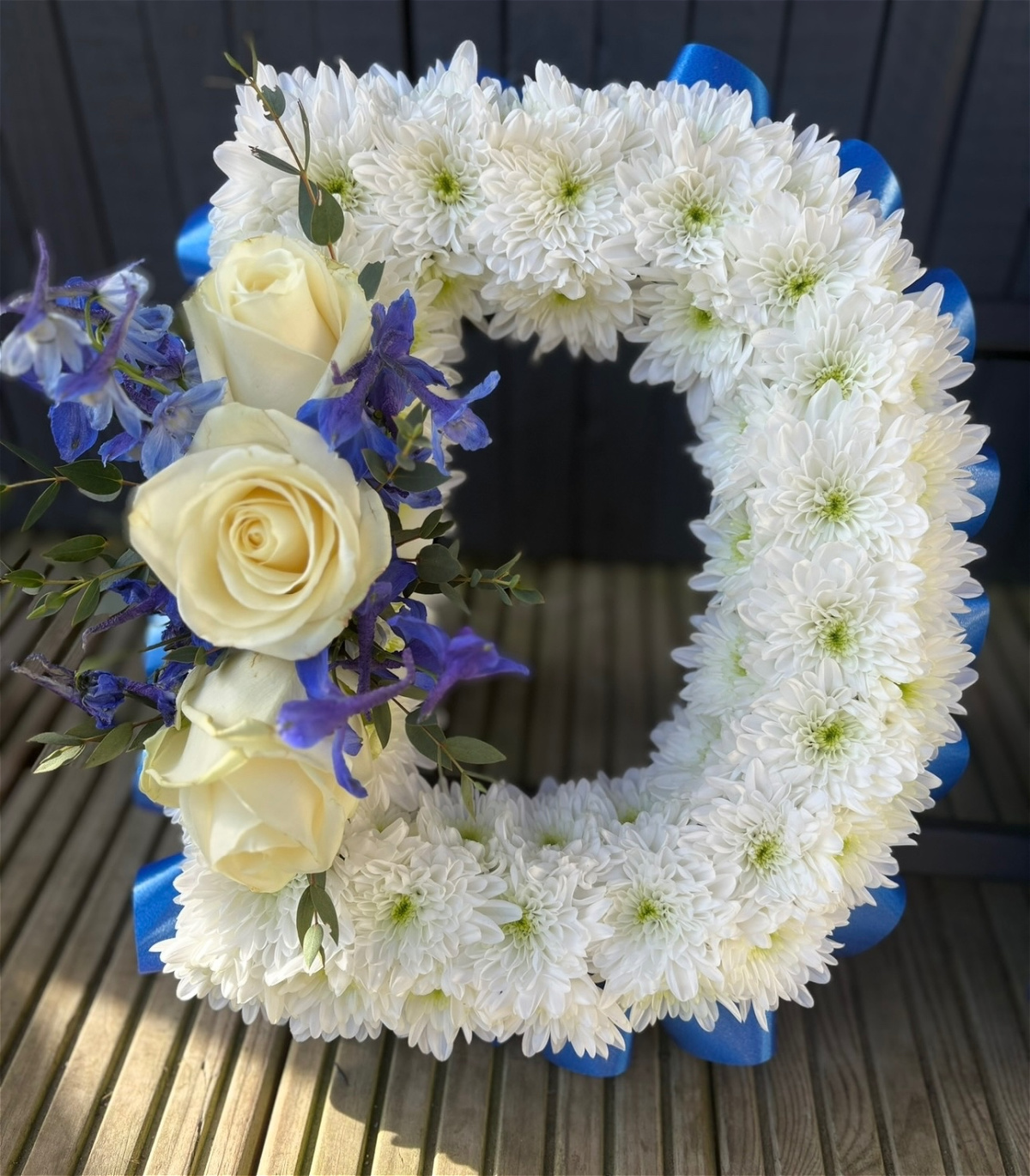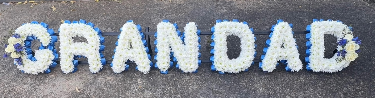Our white based letters with a ribbon edge and with sprays to match including roses and lisianthus. Alternative colour options available