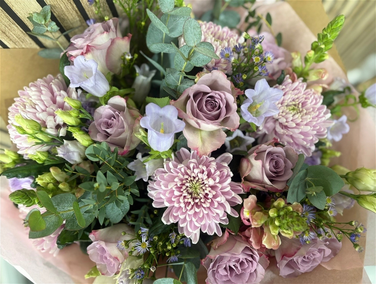 A graceful bouquet of seasonal lilac-toned flowers, beautifully arranged to capture softness, elegance, and calm. Featuring a harmonious mix of fresh lilac blooms complemented by delicate seasonal flowers and lush green foliages, this arrangement is designed to feel both timeless and naturally refined.