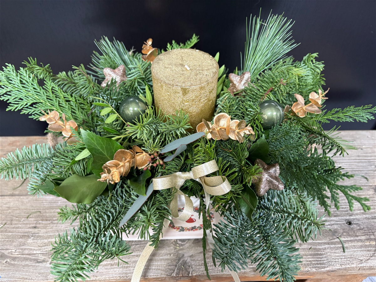 This elegant centrepiece brings a warm golden glow to any festive display. Presented in a rustic white wooden crate adorned with a charming Christmas wreath motif, it’s filled with a lush selection of seasonal evergreens that create a full and luxurious base. Soft gold accents — including shimmering eucalyptus , gilded foliage, and subtle metallic touches — add a sophisticated sparkle throughout the arrangement.