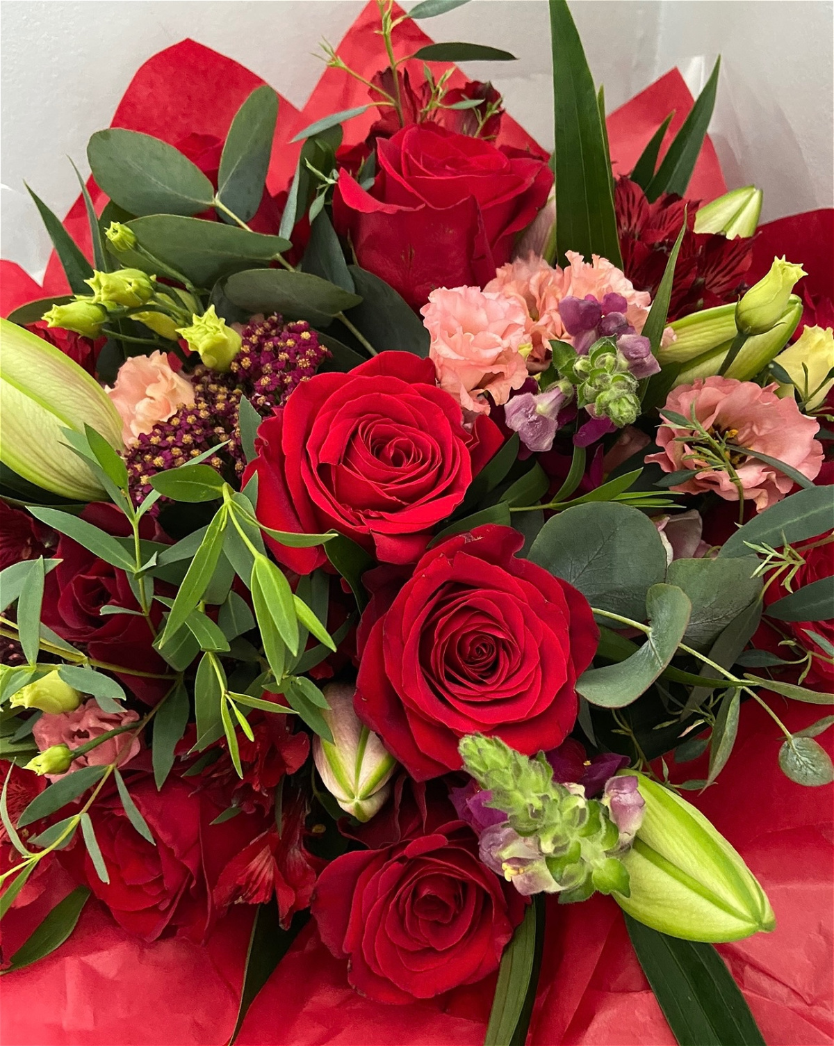 Six premium red roses complemented by an exquisite selection of seasonal florals and rich green foliage. Sophisticated, eye-catching, and designed to leave a lasting impression.
